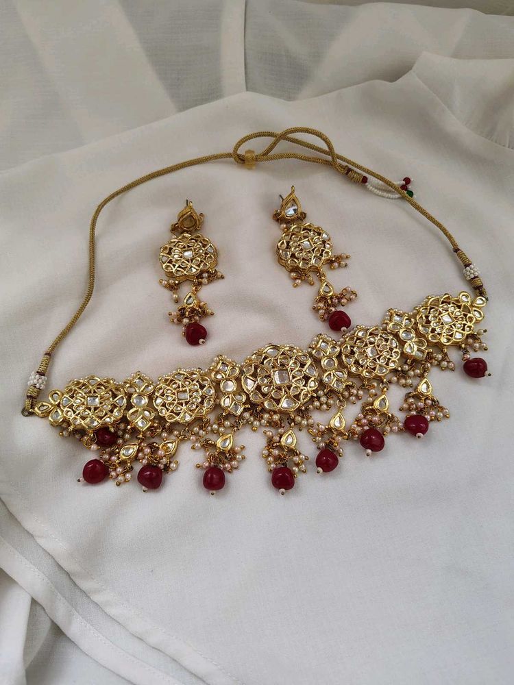 red beads studded kundan choker with earrings