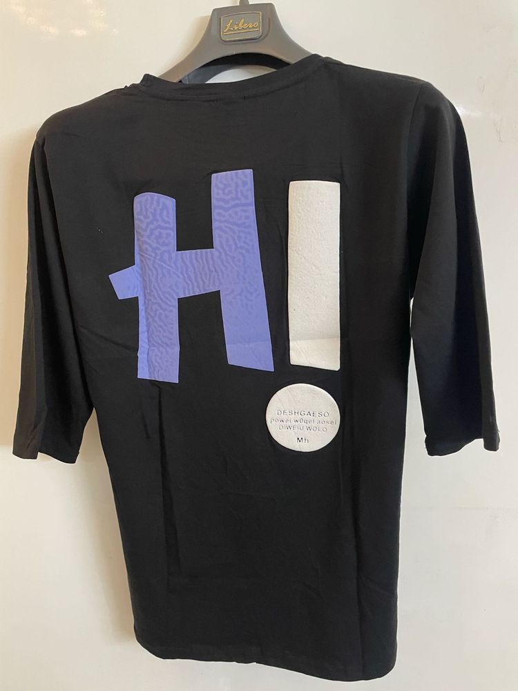 Black three-quarter sleeve t-shirt featuring a playful 'HI' graphic in purple and white. A minimalist yet bold piece that adds a pop of color to your casual wardrobe. The shirt also includes a small circular logo/text graphic. lycra cotton clothe using