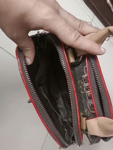 LV Brown Leather Small Backpack cum handbag also can be used as a sling bag... Has two big zipper compartments with smaller pockets inside. One zipper has a missing piece. , No peeling anywhere, Good, spacious, and exquisite.