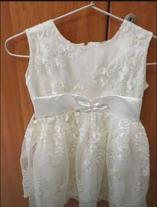 Beautiful off white colored dress with layers of lace and satin tie. Perfect for a flower girl or special occasion! In great condition.