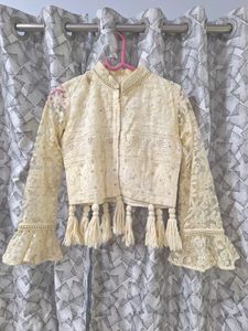 The lengha is a traditional Indian outfit, consisting of a cropped blouse and a full, flared skirt. The blouse has intricate designs and patterns, while the skirt is adorned with detailed embroidery and embellishments. The color palette consists of neutral tones. The lengha in the image is made of a fabric that appears to be rich and textured. It is a beautiful and elegant attire for festive occasions. 🎉