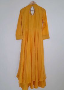 Yellow in colour with hand work embroidery all oven the neck area with good stone work which gives glam look to the dress collar neck front potli design neck comes with back drop cut design .