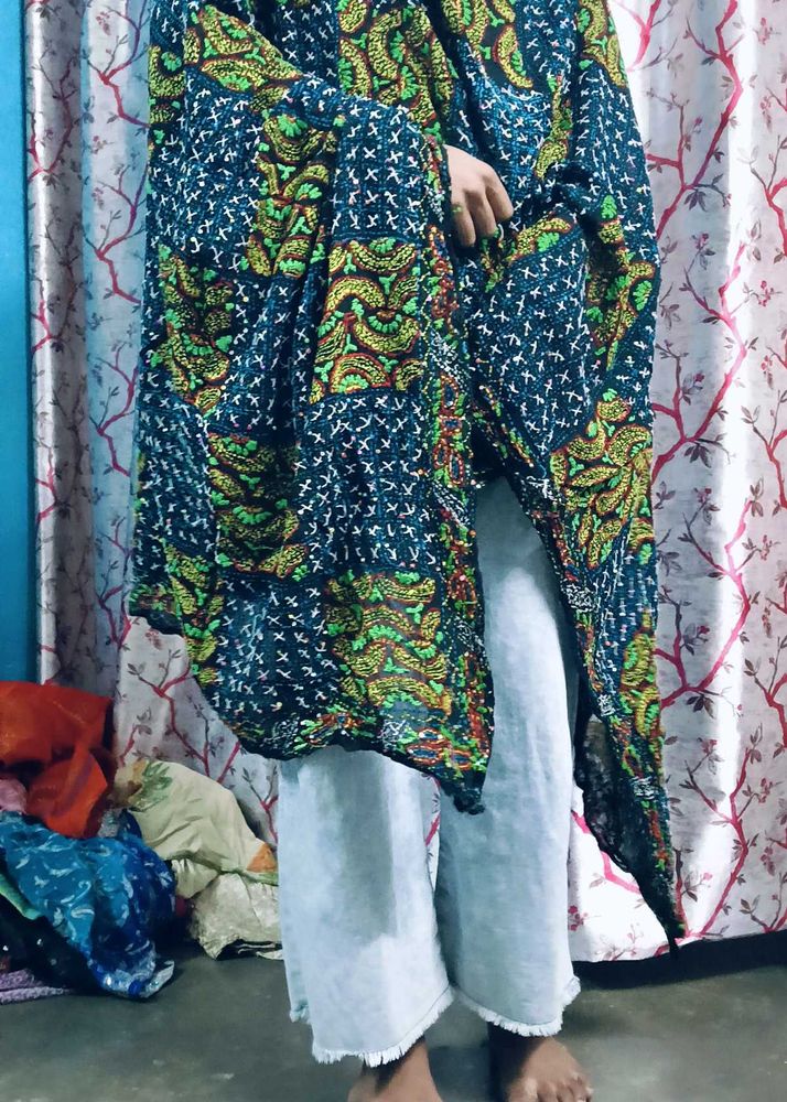 It is dark in color and has rain work done on it. It is best for night functions. It shines more at night and is very beautiful.