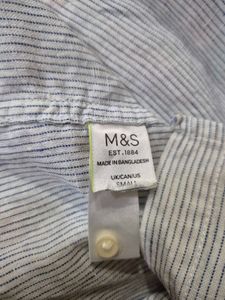 M&S Collection pure linen shirt in size small. Features a light grey and white stripe pattern and a mandarin collar. Made in Bangladesh. Perfect for warm weather!