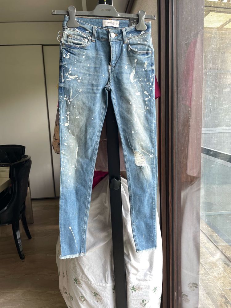 Light wash Mango jeans with a modern edge. Features stylish paint splatter details and distressed accents. Raw hem, skinny fit. Perfect for adding a unique touch to your casual wardrobe.