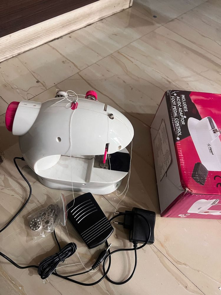 Portable mini sewing machine. Includes foot pedal, AC/DC adaptor, and bobbins. Great for small projects and beginners. Lightweight and easy to use.
