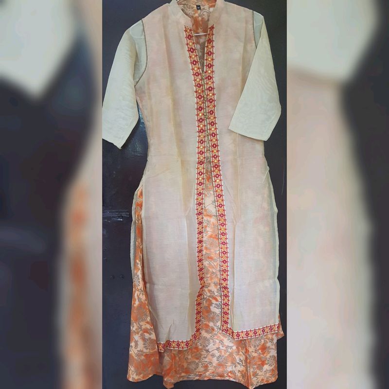 Anarkali style kurta hai with same color jacket attached, mirror work hai front nech par , quarter sleeves hai .