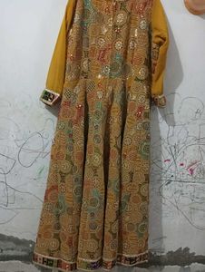 Unique mustard yellow anarkali with colorful geometric embroidery and sequin detailing. Perfect for a party or special occasion! The intricate bead work and shiny accents make it a real statement piece. In great condition.