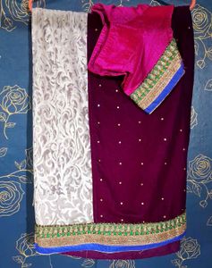 The saree in the image consists of two main sections: a white net-like fabric with intricate patterns and a solid maroon velvet fabric. Both sections are bordered with a gold, green, and blue trim. The blouse, which is a separate piece, is a bright pink color with a matching gold, green, and blue trim on its sleeves. The saree appears to be designed with a blend of traditional and contemporary elements, combining the delicate net fabric with the rich velvet and vibrant colors.