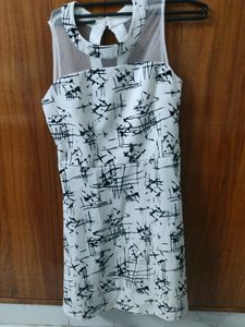offwhite color, thick material, u need not to iron this ..black print with satin black color belt, knee length for 5 fit girl height , 30-32 bust size,one time wear only 1500/- I purchased.