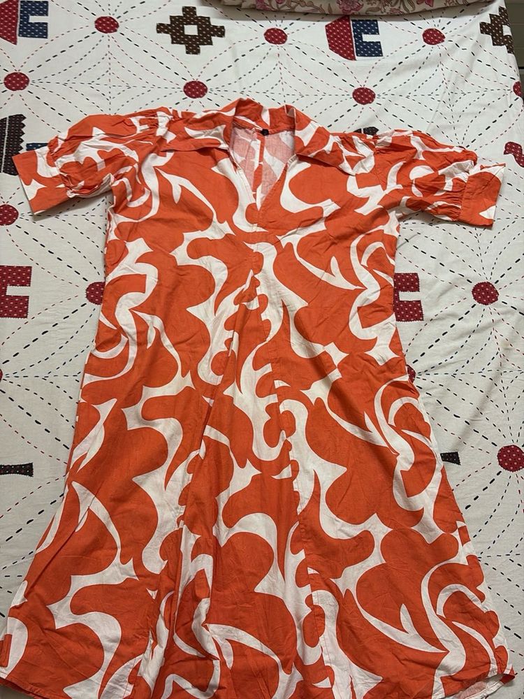 Brighten your wardrobe with this eye-catching orange and white print dress. Perfect for casual outings or special occasions, this dress offers a comfortable fit and a unique style. Add a pop of color to your look!