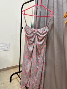 Flowy, lightweight slip dress with a pink and blue paisley print. Features a tie-front detail, adjustable straps, and a midi length. Perfect for summer days and nights! Gently used, in excellent condition. Size: M.