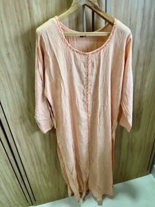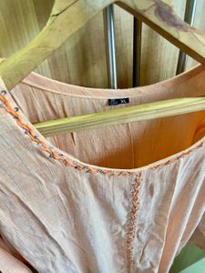 Peach kurti with orange embroidery, round neckline, and 3/4 sleeves. Lightweight fabric, perfect for everyday wear. Has creases from storage, but ironing will refresh its look. Worn only once.