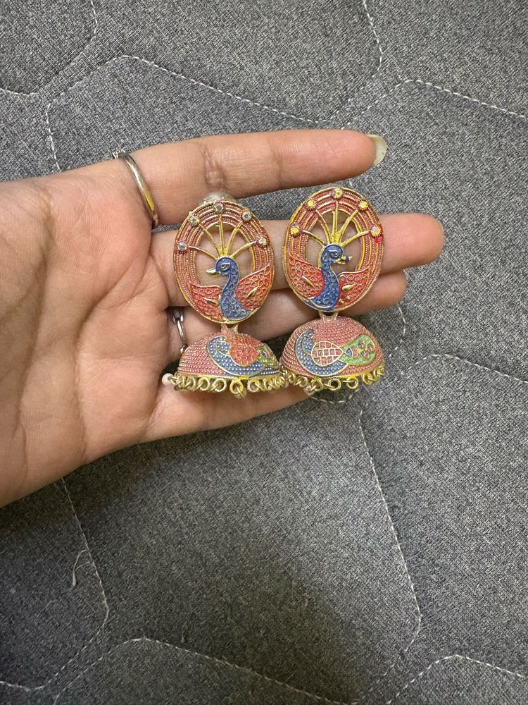 Beautiful pair of jhumka earrings featuring a vibrant peacock design.
