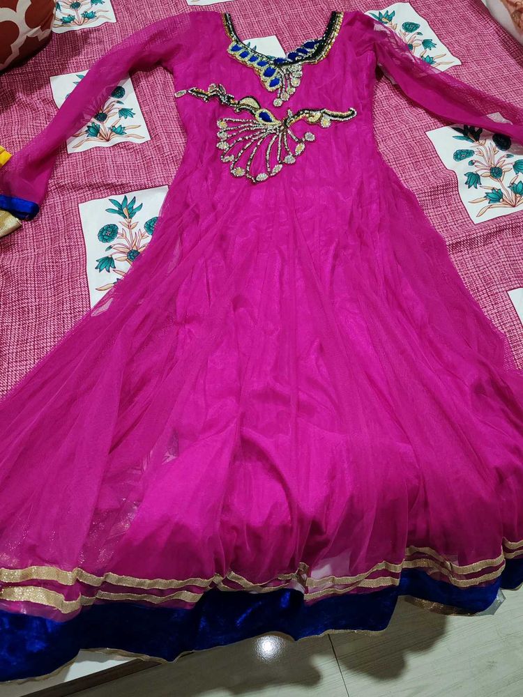 Beautiful pink Anarkali dress with long sleeves. Features a detailed neckline and embellishments. Perfect for parties or special occasions. Size is unknown, please refer to the photos for measurements. It’s in great condition!