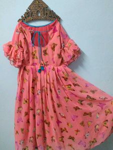 This adorable pink dress features a playful butterfly print and charming ruffled sleeves. Perfect for parties, playtime, or any special occasion. The lightweight fabric makes it comfortable to wear all day long.