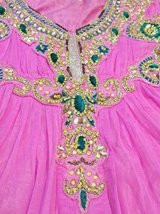 Beautiful net anarkali like pattern, with satin pant and net dupatta, gives a elegant look.Stone and jari work, rich velvet border and embroidery. Not worn more than 2 times. Make this pretty thing yours!
