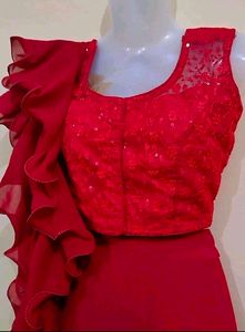 very beutyful Maroon Ruffled dupatta dress veryeligant with full flared plazzo and Blouse color moreof a old rose or dark red maroon bust size is 36 2inch margin fit upto 38 bust you can alter as peryour size no issue it's a partywear dress