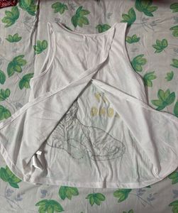 White tank top with gold text and tiger print; features a chic open-back with overlapping panels for a breezy, relaxed vibe.