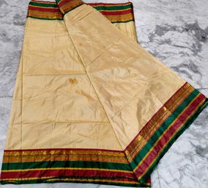 cream colour with multi colour border kanjeevaram pure silk saree with beautiful tassels in pallu , expensive saree.no damage.visible stains, need dry wash or u can diable any colours.