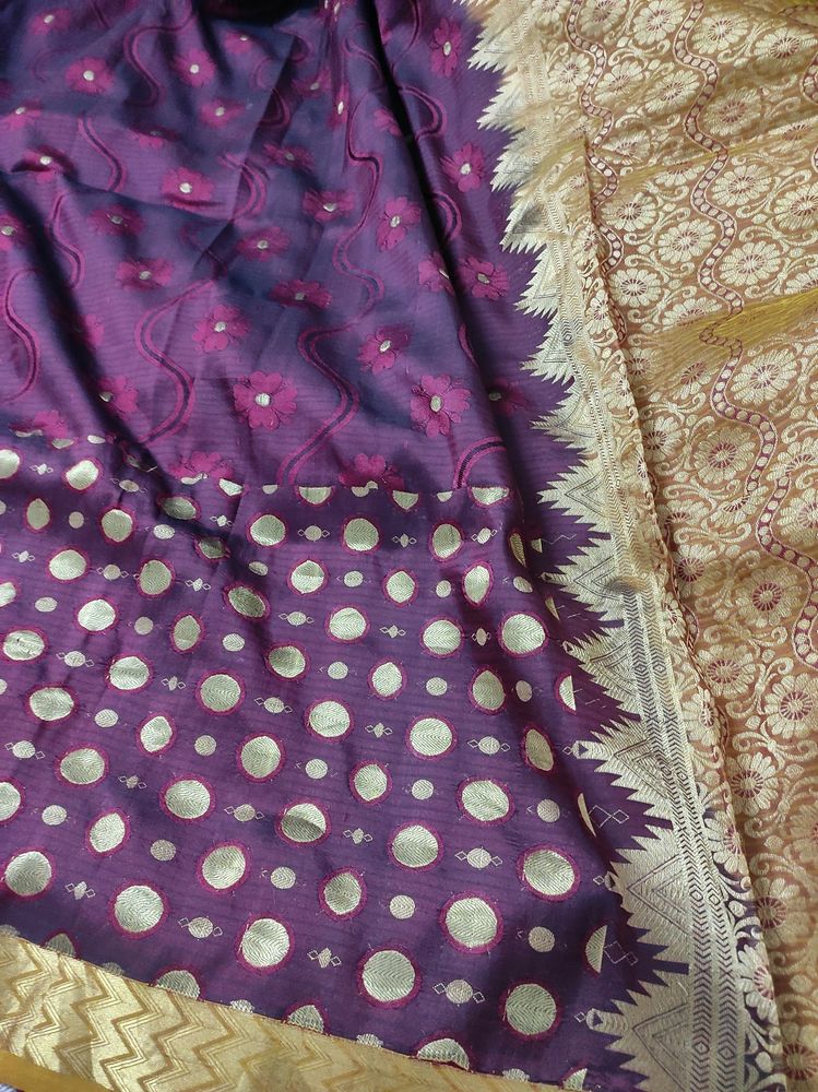 amazing kanjeevaram with very beautiful weaving all over body and heavy palla. no defects। gently worn 2-3 times for functions. the bottom part has coins like golden weaving and upper part has wavy lines with flowers woven beautifully.