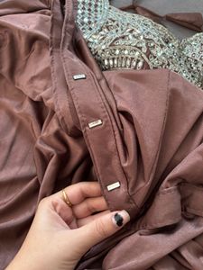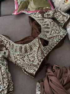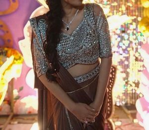 Beautiful brown blouse with ready to wear saree silver embroidery and mirror work. Perfect for festive occasions or weddings. Stand out with this unique piece!