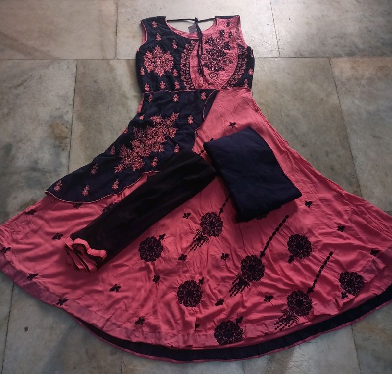 Readymade Pink And Navy Blue Anarkali Set with Pajama And Dupatta