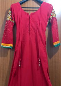 Red kurta .lost bottom n duppatta so selling. nice kurta used only 3 times. good in condition only small flaw shown in 1 pic seleves of one arm fabric has flaw. burst size 30 inch, waist 36 inch ,length 43 inch.