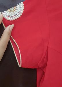Red color ki saree hai, poore borders pe pearl ka work hai and design poori saree pe same hai jaisa image mai show ho rha hai. Blouse front se simple hai and back se pearl work hai and sleeves pr bhi peark work hai.