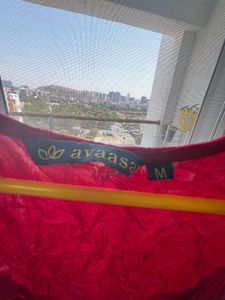 A red sleeveless tunic with button down closure. Features a small pocket with embroidered detail. Lightweight and perfect for layering or wearing on its own.