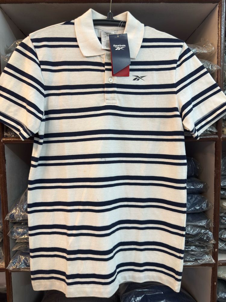 Classic Reebok polo shirt with a stylish striped pattern. Perfect for casual wear or a sporty look. Comfortable and breathable fabric. Great for everyday wear.