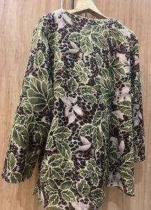 Stylish ribbed blouse featuring a unique mixed print of animal spots and green floral patterns with a visible white patch underneath. Barely worn and looks as good as new.