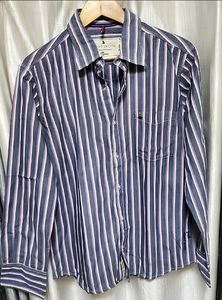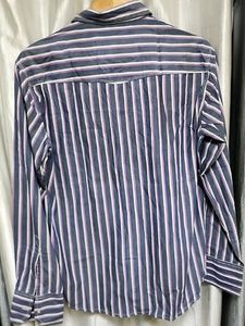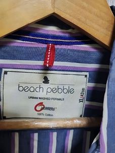 This Rich Pebble button-down shirt features a stylish striped pattern in shades of blue, white, and pink. It's a long-sleeved, collared shirt with a button-down front, a chest pocket, and a subtle logo detail. Perfect for a casual yet put-together look.