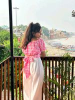 top is from amazon worth 700 and the quality is amazing .short is from american eagle worth 1680. top i wore only once and short i never wore . so both are new only don't think about it its very cute and branded... selling only because i gained weight . Adorable matching set featuring a pink and white gingham crop top and white denim shorts. Perfect for a casual, trendy look. The top has a unique off-the-shoulder design, and the shorts have delicate lace detailing. Great for summer outings or a fun day out with friends!