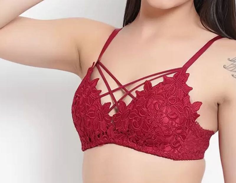 This red lace bralette features delicate floral patterns, offering a perfect blend of elegance and comfort. Designed with soft, stretchable fabric, it provides a flattering fit and light support. The intricate lace detailing adds a touch of allure, making it ideal for layering or wearing solo with confidence.