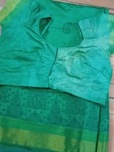 Shaded Green saree with stitched blouse @ chikan kadai booty all over saree @ Border pallu @ border on saree @ shaded Green blouse stitched.. suitable for sizes 36-40in 35in upper waist length @ border on blouse as well @ go through all specification before ordering @ no return @ no return