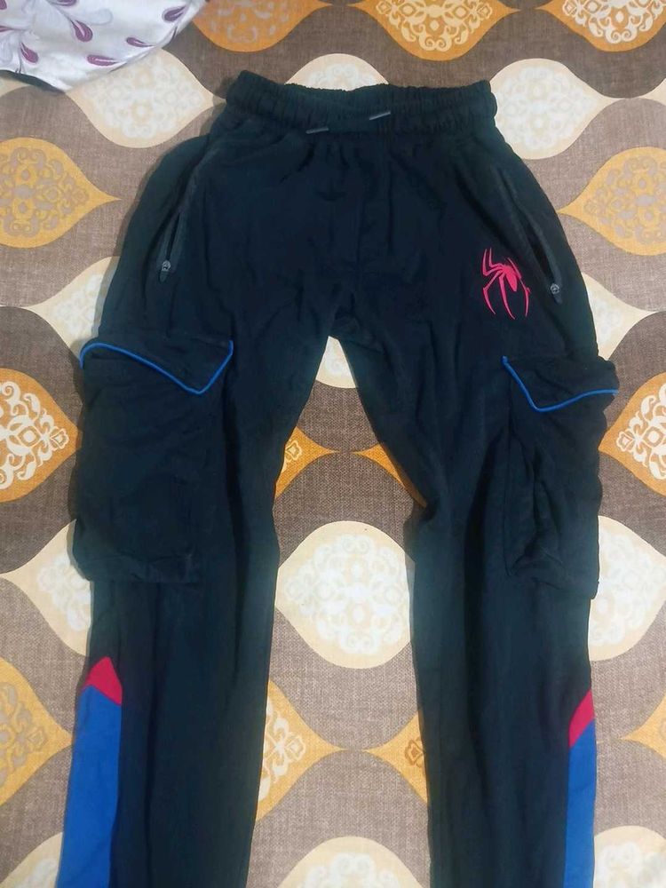 Black cargo sweatpants with red spider logo and side stripes. Perfect for casual wear or lounging around. Comfortable fit with multiple pockets.