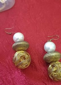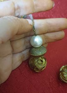 Unique, eye-catching beaded dangle earrings. These feature a combination of pearl-like beads, textured metal beads, and intricate woven wire details. Perfect for adding a touch of vintage-inspired flair to any outfit. These earrings are sure to make a statement! excellent condition!!