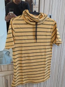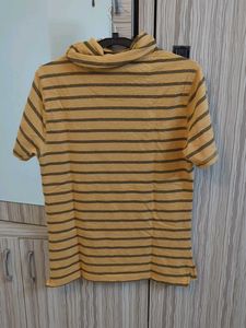 Mustard yellow striped T-shirt with unique cowl neck. Soft and comfortable fabric, perfect for casual outings. Elevate your wardrobe with this stylish piece!