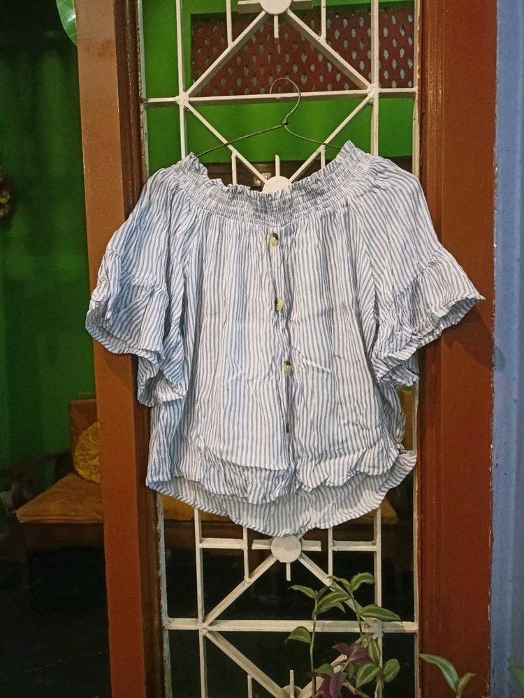 Cute and breezy striped off-the-shoulder top with button-down front. Features ruffled sleeves and a comfortable, stretchy neckline. Perfect for warm weather!