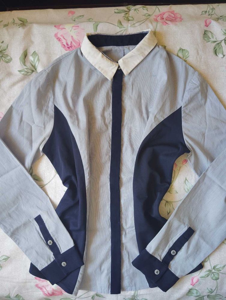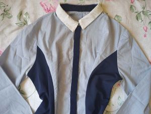 Unique button-up with light gray pinstripes and navy blue panels. Cream colored collar. Long sleeves with buttoned cuffs. Great for a casual or professional look. In good condition.