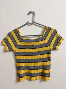 Add a pop of color to your wardrobe with this fun yellow and black striped top! Features include a square neckline as well as off shoulder,short sleeves, and pleated texture. Perfect for adding a playful touch to any outfit. Pair it with jeans, skirts, or shorts for a casual chic look.