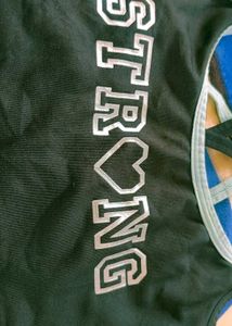 This stylish black sports bra features the word 'Strong' and a heart design. Perfect for workouts or everyday wear. Comfortable and supportive, it's a great addition to your activewear collection. The bra has a unique strap design.