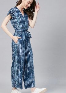The StyleStone blue and white tie-dye printed jumpsuit is a stylish yet comfortable choice for casual outings. Made from soft viscose rayon, it features a flattering V-neck, short sleeves, two functional pockets, and adjustable waist tie-ups for a customizable fit.