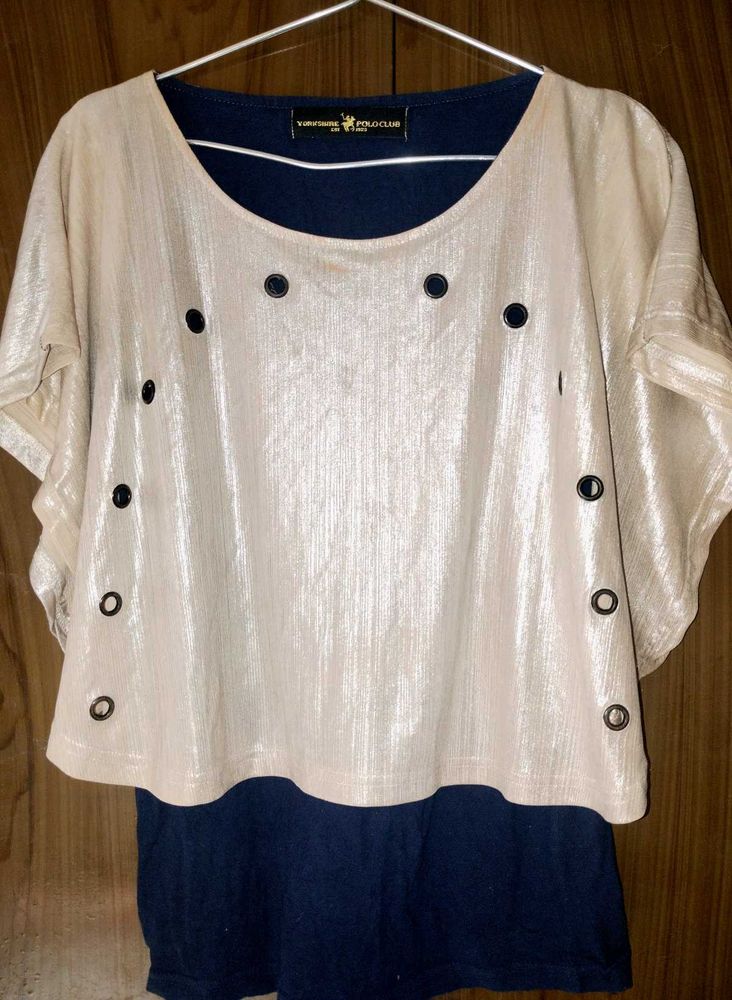Unique Polo Club top featuring a stylish layered look. The outer layer is a shimmering beige fabric with decorative eyelets. A navy blue layer underneath adds depth and contrast to the design. Perfect for adding a touch of sophistication to any outfit.
