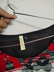 This unique top features a bold red and white stripe pattern with playful holiday ornament designs. It has trendy cold shoulder cutouts and a comfortable black underlayer. The asymmetrical hem adds a fashionable touch to this eye-catching piece.
