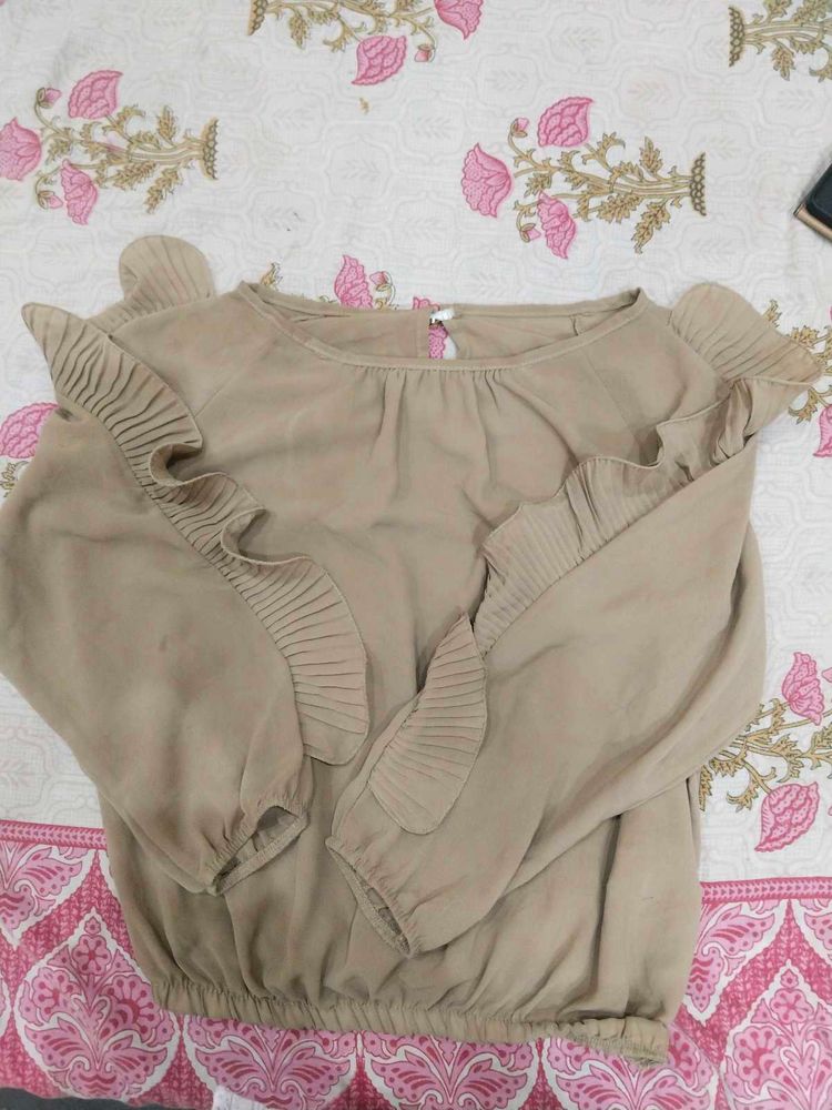 Elevate your casual wardrobe with this elegant beige ruffle-sleeve blouse. Featuring a relaxed, flowy fit, this top is crafted from a lightweight, breathable fabric, perfect for all-day comfort. The standout detail is its pleated ruffle accents cascading along the sleeves, adding a touch of feminine charm and sophistication. Designed with a round neckline and elasticated cuffs, it pairs effortlessly with jeans or tailored pants for a chic, polished look. Ideal for both work and casual outings.