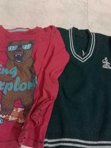Green Sweater full sleeve Strachable woolen for 4-5 years Light reddish Full sleeve Strachable T-shirt for 4-5 years boys used but material is good for kids daily wear perfect for winter minor stiching required on T-shirt one shoulder it's long lasting,u can used whole winter