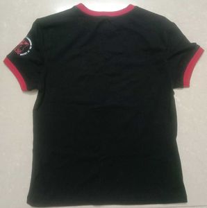 Black tee with a print and a logo print on left sleeve