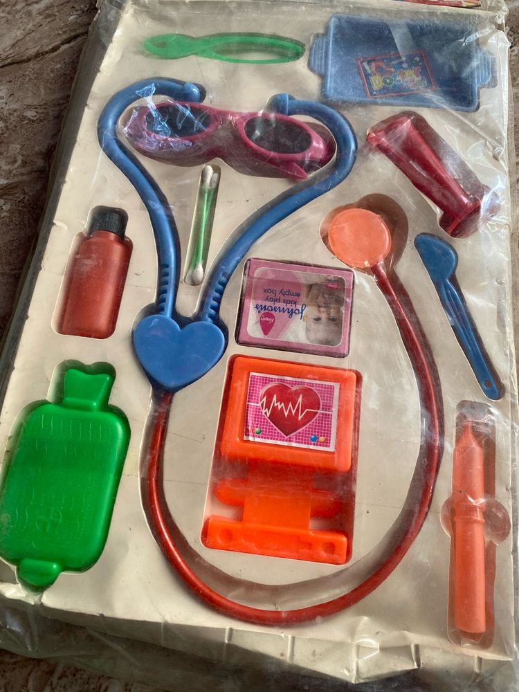 Vintage doctor play set, still sealed in the original packaging. Includes a variety of plastic medical tools for imaginative play. Some wear to the packaging, see photos for condition.